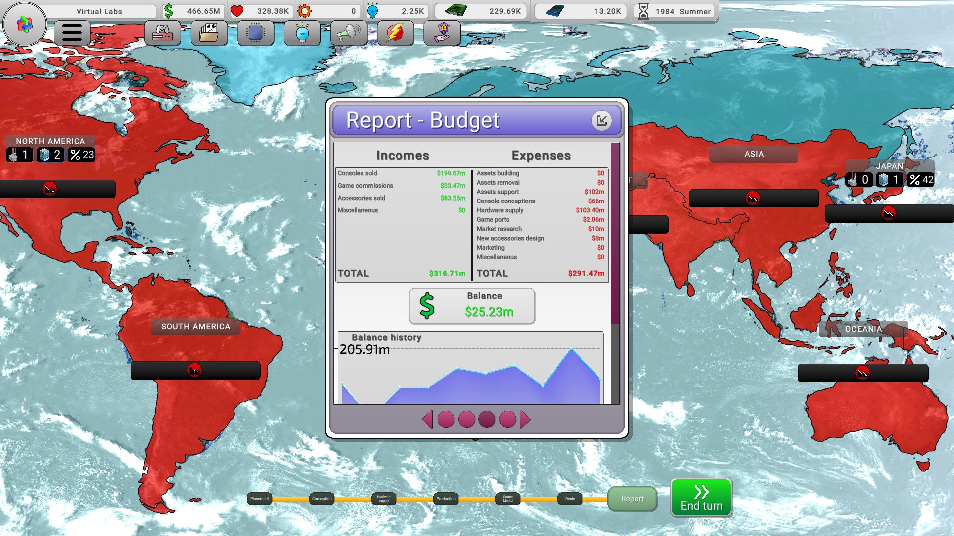 Console War Giant is a turn-based management game that puts you in charge of a young company producing video game consoles! The year is 1980, and the gaming industry is still in its infancy. A place under the sun is yours to claim!