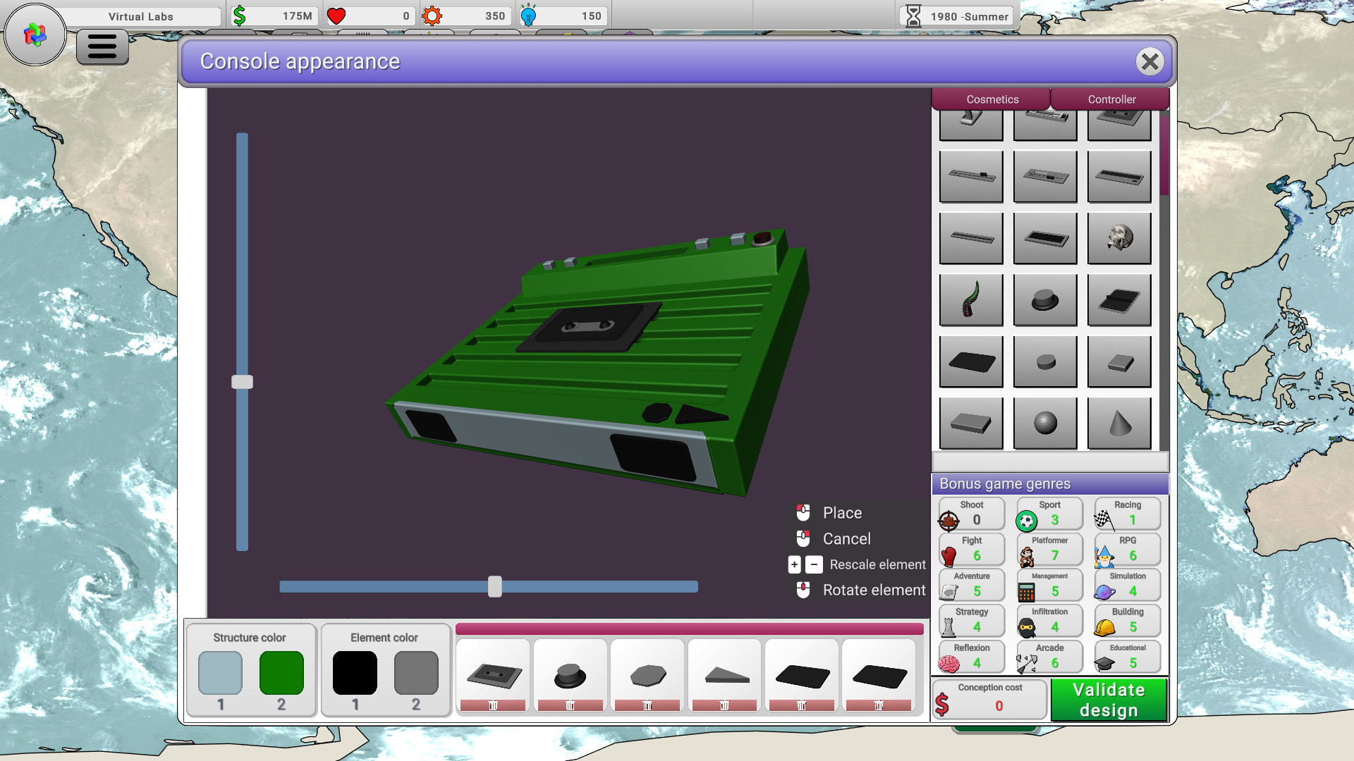• Design your own consoles and controllers using a dedicated 3D interface. Then, choose their technical specifications according to your goals.